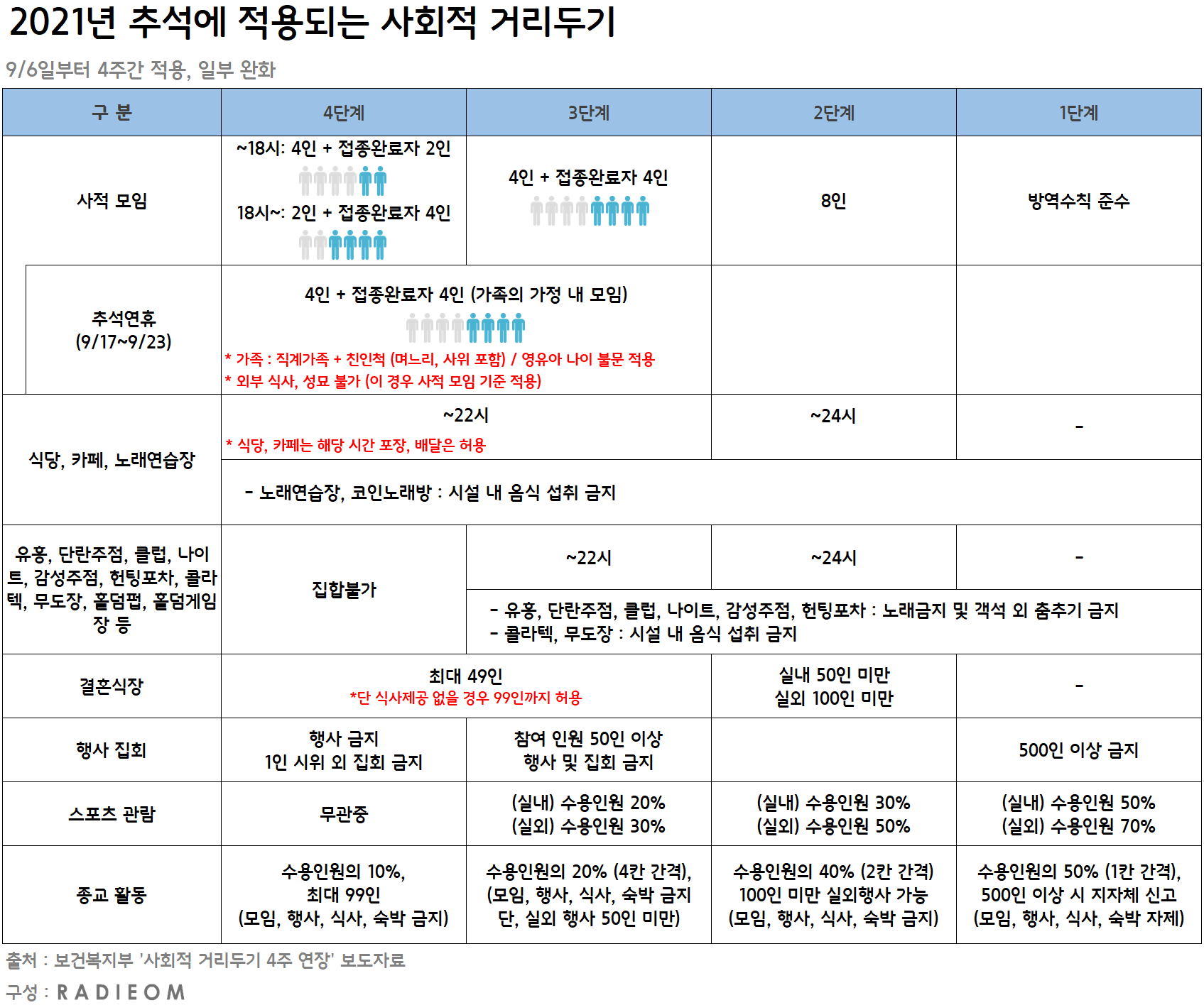 - 사적모임 제한 인원 완화 : 4단계(4인→6인), 3단계(6인→8인) *접종완료자 포함